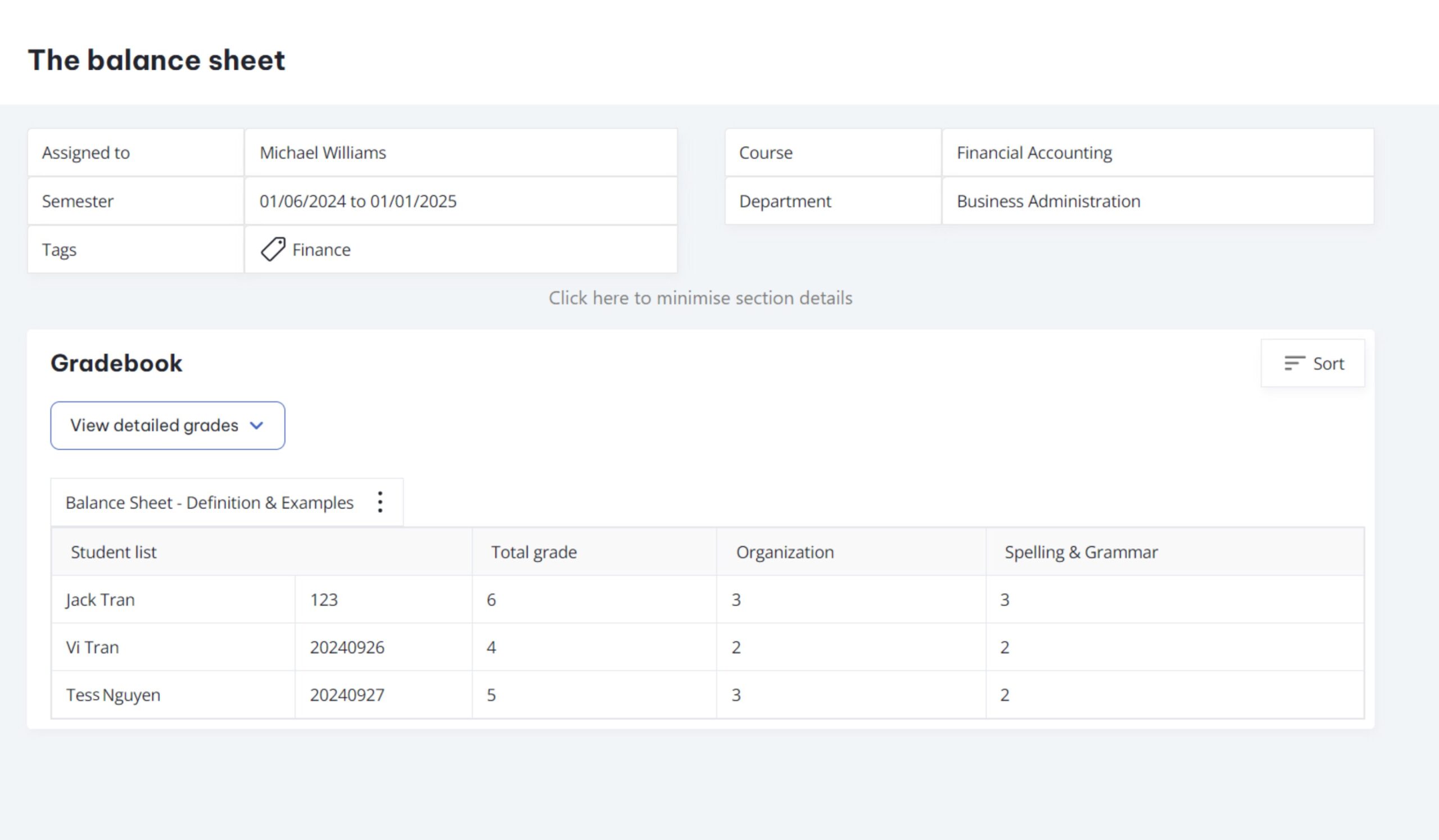 The gradebook feature enables teachers to manage and download assignment results for each class section. It presents a table with student names, IDs, grades across various categories, and total grades for each assignment. This helps teachers identify students’ strengths and weaknesses, making it easier to assess performance on specific assignments. Graded results can be downloaded as a CSV file. There are different views included, like: